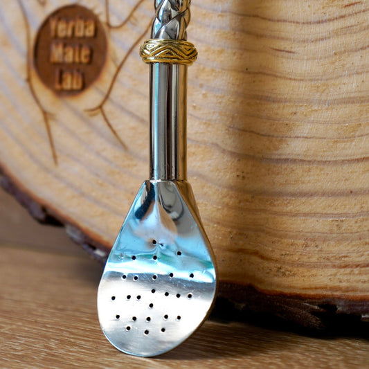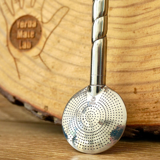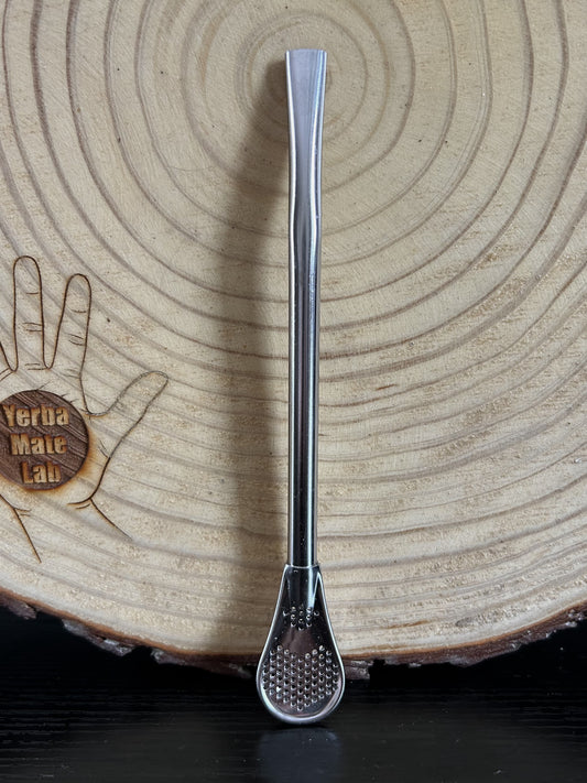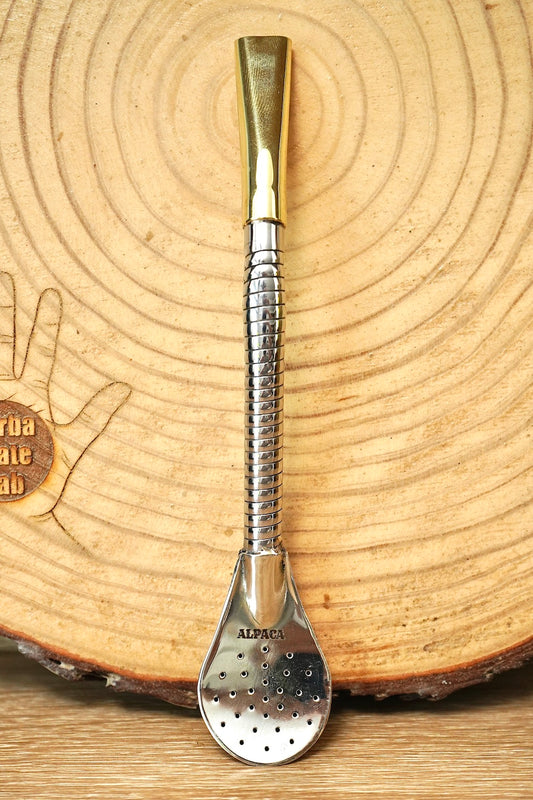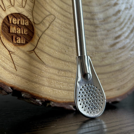 A bombilla is a special metal straw used for drinking yerba mate. It acts as both a straw and a filter, straining the yerba and letting only the liquid through. Traditional yerba mate bombillas can be made of stainless steel, alpaca (a nickel silver alloy), and even bamboo. The strainer head can come in different shapes and sizes, each with their own pros and cons.