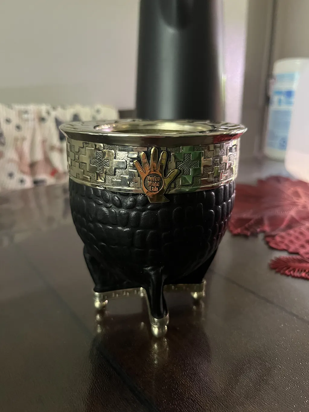 One of the finest imperial mates you'll ever come across. Handcrafted in Argentina, take your time and admire all the details built into this gourd because there's a lot to take in. From the textured croc leather wrapped around the calabash... to the chiseled designs on the metal rim.. and finally, to the decorative metal base that holds it all together and stands this masterpiece up on its own four balled feet. This is not just a mate gourd, but a work of art.